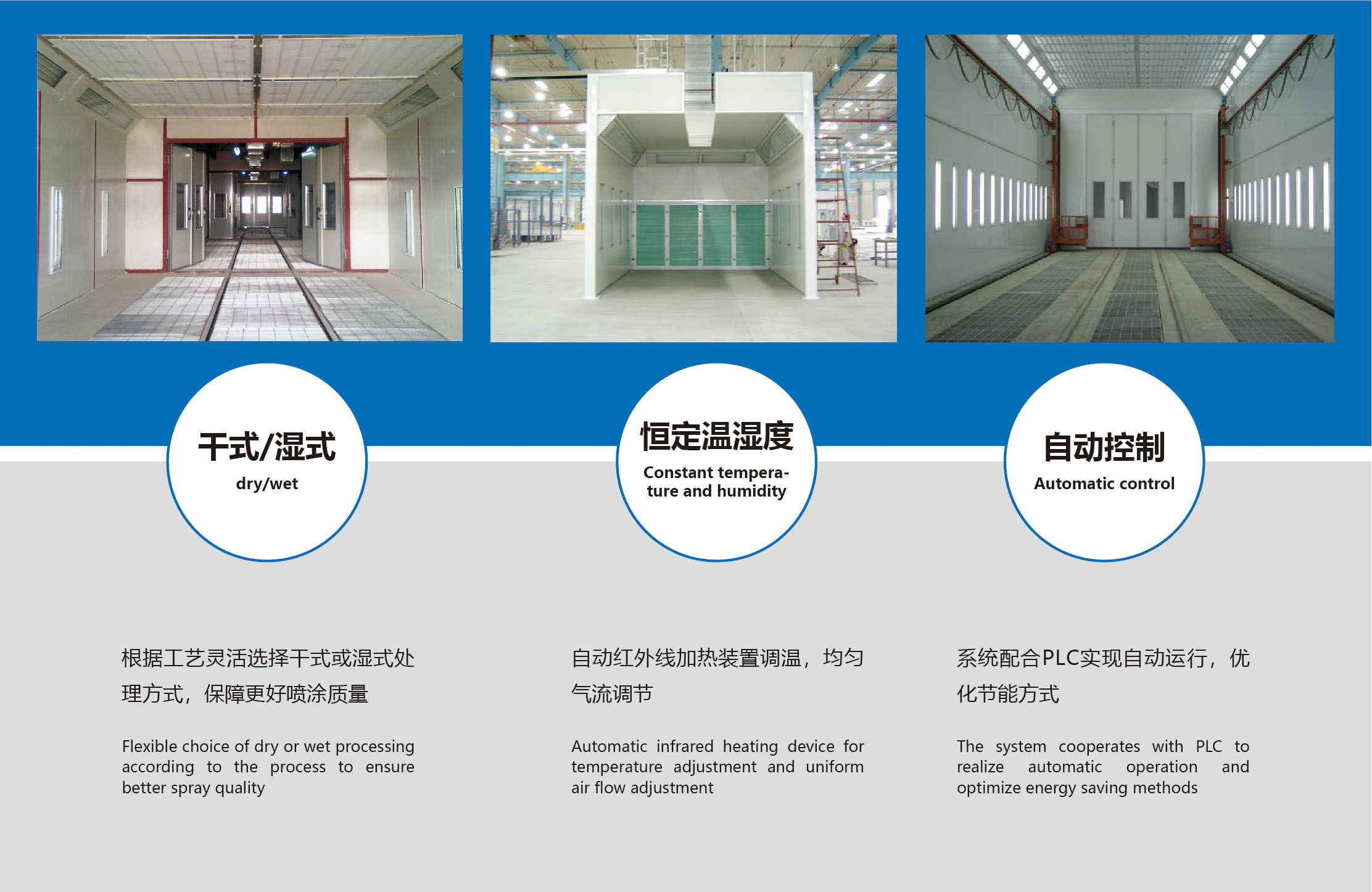 工業噴漆房可有效提升工件噴涂質量并保障作業空間的清潔度,通常分為上送下排式和側進側排式。噴漆時,外部空氣經過初級過濾網后由風機送到房頂,再經過頂部過濾網二次過濾凈化后進入房內。房內空氣采用全降式,以0.2-0.3m/s的速度向下流動,使噴漆后的漆霧微粒不能在空氣中停留,而直接通過底部出風口被排出房外。這樣不斷地循環轉換,使噴漆時房內空氣清潔度達98%以上,且送入的空氣具有一定的壓力,可在工件的四周形成一恒定的氣流以去除過量的油漆,從而更大限度地保證噴漆的質量。