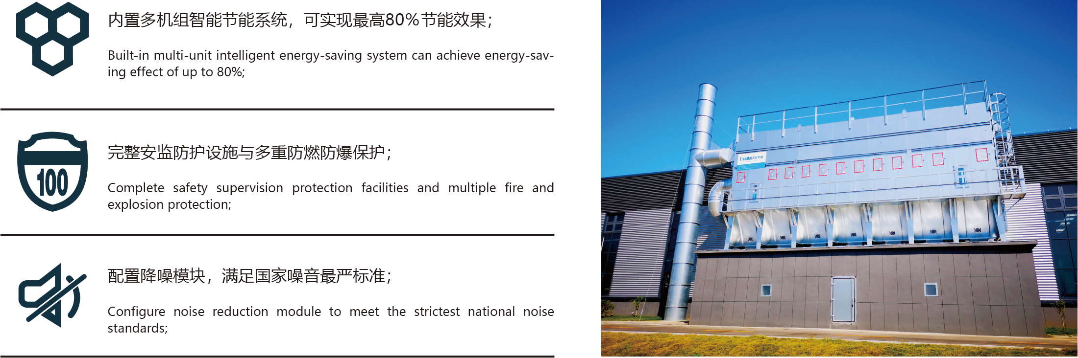 除塵器系統運行時,因設備采用高效負壓風機,生產場所各揚塵點所發生的粉塵被捕集,并進入高壓輸送管,由于慣性作用直接落下,起到預收塵的作用,輕細粉塵則隨空氣進入脈沖袋濾式除塵器。脈沖袋濾式除塵器主要利用高密度過濾材料,對含塵氣體進行過濾分離,同時利用在線式脈沖噴吹系統,引導壓縮空氣對濾袋進行逆向噴吹,利用噴吹時濾袋的急劇膨脹震動及方向氣流的作用,將粉塵震落至除塵器底部,再由排料系統排出。